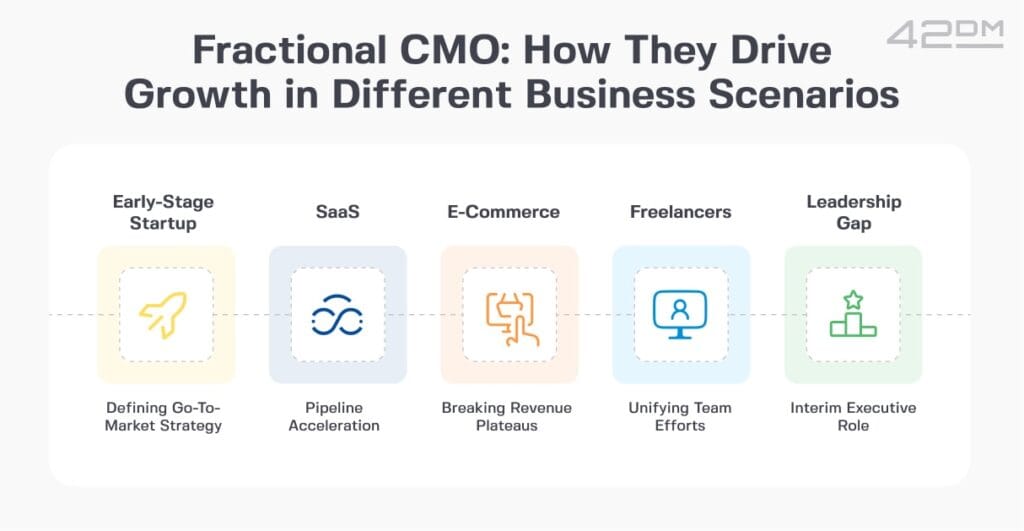 A fractional Chief Marketing Officer isn’t just a part-time strategist; they step into the business with clear ownership and deliver hands-on leadership where it matters most. Here are a few real-world scenarios that show what fractional CMOs actually do inside companies of different sizes and maturity levels: