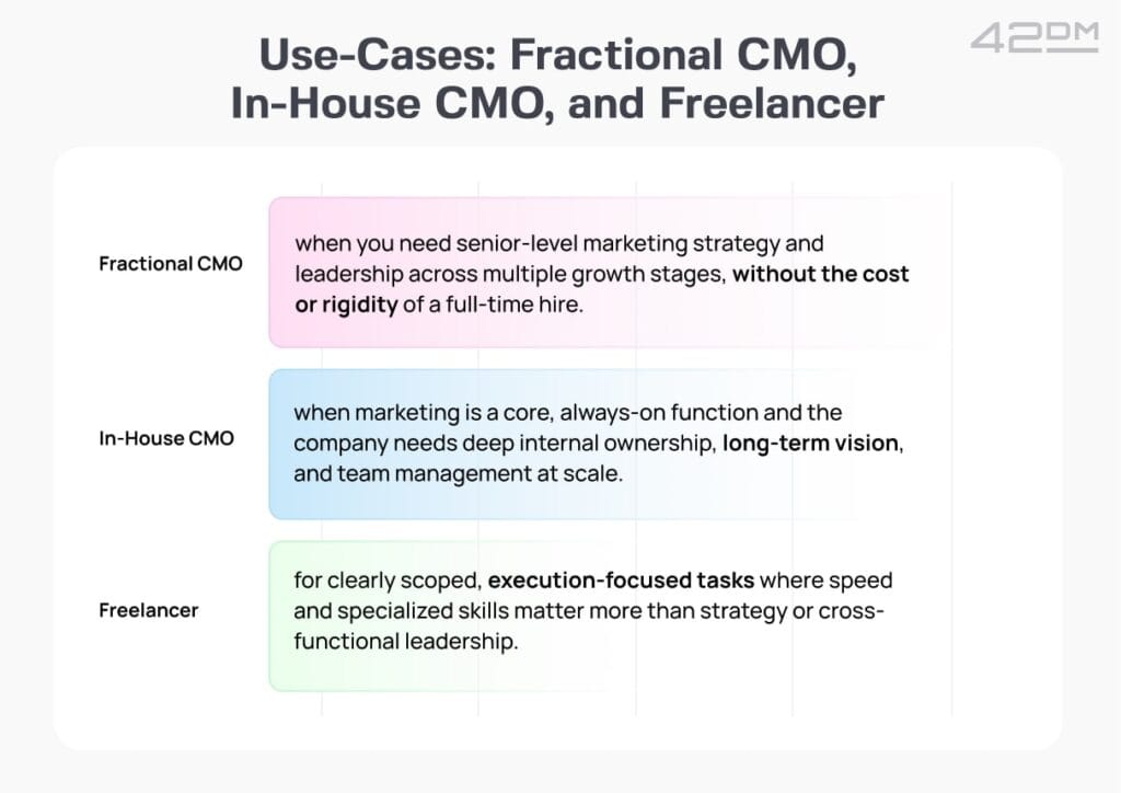 Discover the pros, cons, and perfect use cases for a Fractional CMO, in-house CMO, or marketing freelancer, to choose one for your business.